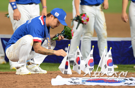 한국 야구대표팀이 대만을 꺾고 금메달을 차지했다. 인천아시안게임 야구 한국과 대만의 결승전 경기가 28일 인천구장에서 열렸다. 대표팀이 대만을 6-3으로 꺾고 금메달을 차지한 가운데 금메달을 목에 건 오재원이 태극기를 꽂고 있다.