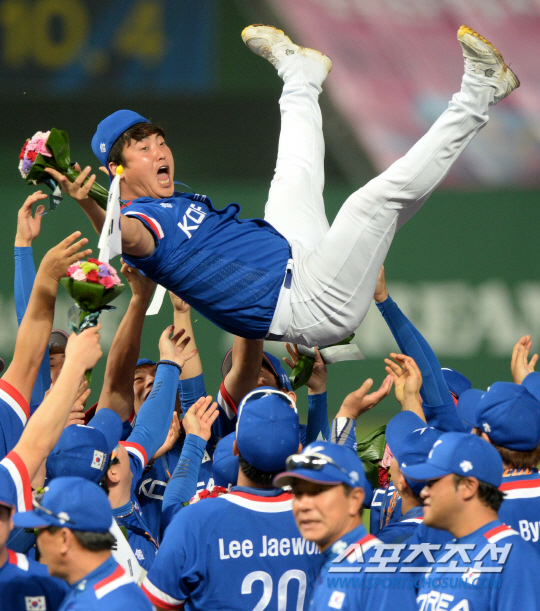 2014 인천 아시안게임 야구 결승전 한국과 대만의 경기가 28일 인천 문학구장에서 열렸다. 한국이 대만을 6-3으로 누르고 금메달을 획득했다. 이어 진행된 시상식에서 안지만이 선수들에 행가레를 받고 있다. 인천=허상욱 기자 wook@sportschosun.com