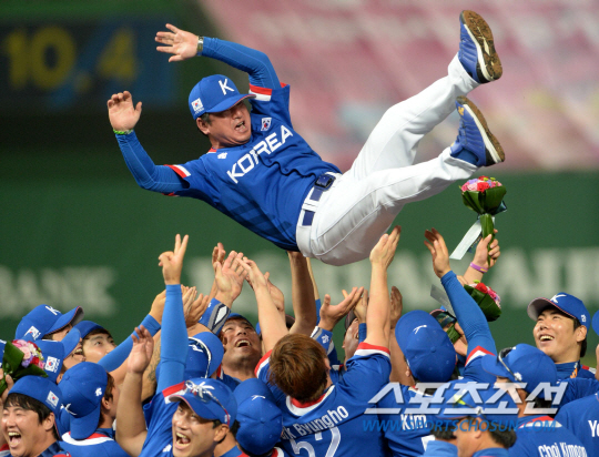 2014 인천 아시안게임 야구 결승전 한국과 대만의 경기가 28일 인천 문학구장에서 열렸다. 한국이 대만을 6-3으로 누르고 금메달을 획득했다. 이어 진행된 시상식에서 류중일 감독이 선수들에 행가레를 받고 있다. 인천=허상욱 기자 wook@sportschosun.com/2014.09.28/