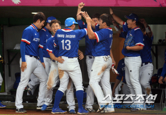 한국야구대표팀과 대만야구대표팀의 2014인천아시안게임 야구결승전이 28일 인천문학야구장에서 열렸다. 한국 8회초 2사 .2,3루에서 황재균이 2타점 적시안타를 치고 동료들과 환호하고 있다. 인천=최문영 기자 deer@sportschosun.com /2014.09.28/