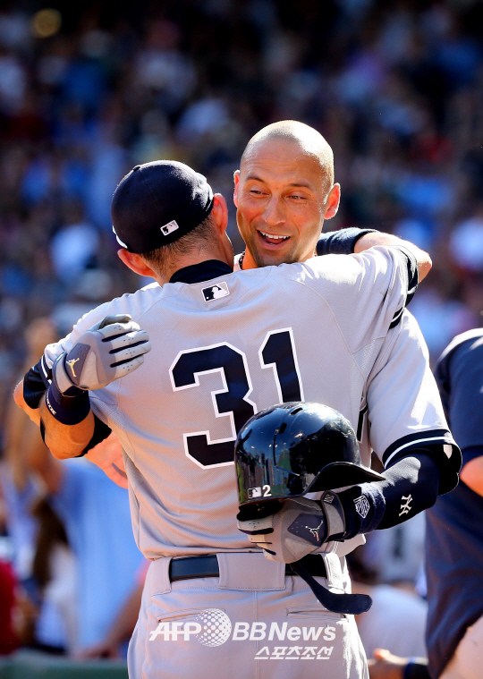 | 이치로가 올 시즌을 마지막으로 현역에서 은퇴하는 데릭 지터와 포옹하고 있다. ⓒAFPBBNews = News1 |