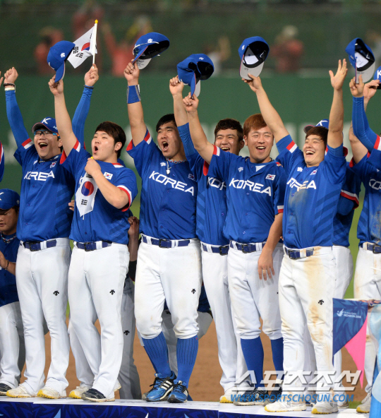 2014 인천 아시안게임 야구 결승전 한국과 대만의 경기가 28일 인천 문학구장에서 열렸다. 한국이 대만을 6-3으로 누르고 금메달을 획득했다. 이어 진행된 시상식에서 시상대에 오르며 환호하는 선수들의 모습. 인천=허상욱 기자 wook@sportschosun.com/2014.09.28/