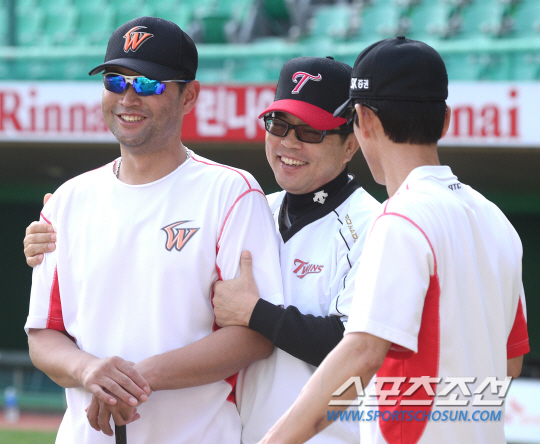 4연승을 거두며 4위 싸움에서 한 발 앞선 LG가 SK와 2연전을 벌인다. 28일 인천 LG-SK전을 앞두고 LG 양상문 감독이 훈련을 지켜보고 있던 SK 김경기, 성준 코치와 반갑게 인사를 나누고 있다. 인천=정재근 기자cjg@sportschosun.com/2014.08.28/ |