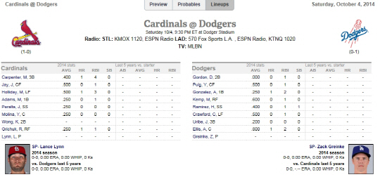 반면 세인트루이스는 타순에 변화를 주었다. 1차전에서 4타수 무안타로 타격감이 안 좋았던 코즈마를 빼고 대신 메이저리그 2년차 콜튼 웡을 선발 카드로 뽑았다. 첫 선발 포스트시즌 경기다. 웡은 이번 시즌 빅리그 113경기에 출전, 타율 2할4푼9리, 12홈런, 42타점, 20도루를 기록했다. 발이 매우 빠르다. 그레인키를 상대로는 3타수 1안타를 기록했다. 웡은 하와이 출신이다. 2008년 신인 드래프트에서 미네소타 트윈스의 지명을 받았지만 포기하고 하와이대에 진학했다. 부친 카하 웡도 야구 선수 출신으로 하와이대에서 아들을 지도했다. 지난 5월 이달의 신인상을 받은 적도 있다.