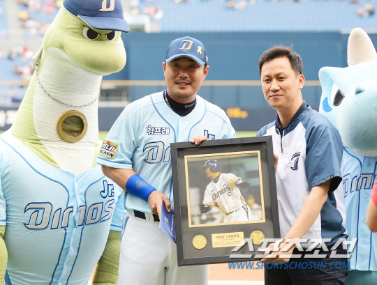 삼성 라이온즈와 NC 다이노스의 2014 프로야구 경기가 22일 마산구장에서 열렸다. 경기 전 NC 이호준이 개인통산 1000타점 기록에 대한 시상식이 열렸다. 이호준은 1996년 5월 15일 광주 무등야구장에서 열린 OB베어스와 해태 타이거즈 경기에서 첫 타점을 올린 후 2014년 6월 17일 마산 롯데와의 경기에서 1000타점을 기록했다. 역대 11번째 기록이다. 마산=정재근 기자 cjg@sportschosun.com/2014.06.22/ |