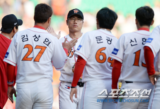 SK와 한화의 2014 프로야구 경기가 5일 인천 문학구장에서 열렸다. SK가 6-3으로 승리를 거뒀다. 승리를 거둔 선수들이 기쁨을 나누고 있다. 인천=허상욱 기자 wook@sportschosun.com