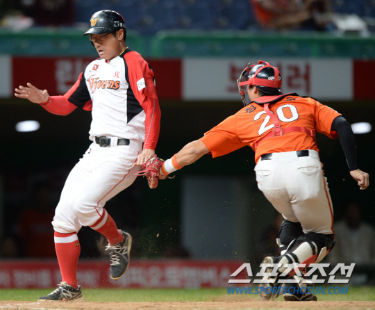 SK와 한화의 2014 프로야구 경기가 6일 인천 문학구장에서 열렸다. 4회말 2사 2루 SK 이재원의 안타슌 홈으로 파고들던 2루주자 박정권이 한화 포수 정범모에 태그아웃되고 있다. 인천=허상욱 기자 wook@sportschosun.com