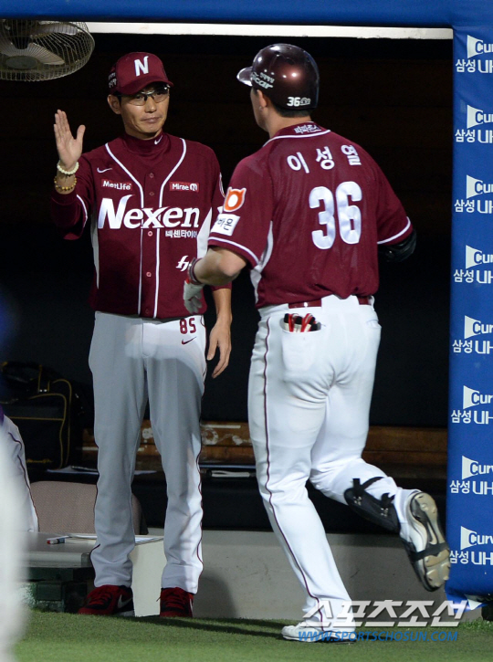 4경기 반 차이로 1-2위를 달리고 있는 삼성과 넥센이 31일 대구구장에서 만났다. 5회초 넥센 이성열이 삼성 장원삼의 투구를 받아쳐 우측담장을 넘어가는 솔로홈런을 날렸다. 염경엽 감독과 하이파이브를 하는 이성열. 대구=허상욱 기자 wook@sportschosun.com/2014.08.31/ |