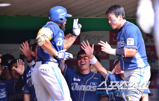 14일 오후 인천 문학구장에서 2014 프로야구 NC와 SK의 경기가 열렸다. 2회초 무사서 NC 테임즈가 우중월 솔로홈런을 친 후 덕아웃에서 김태군과 '수염뽑기' 세리머니를 펼치고 있다. 인천=김경민 기자 kyungmin@sportschosun.com / 2014.09.14. |
