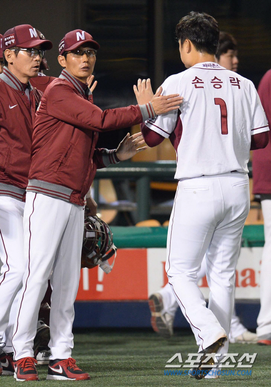 2014 프로야구 넥센히어로스와 KIA타이거즈의 경기가 7일 목동야구장에서 열렸다. 넥센 염경엽감독과 손승락이 KIA를 상대로 6대3 승리를 거둔후 하이파이브 하고 있다. 이날 승리로 넥센은 플레이오프 진출을 확정지었다. 목동=최문영 기자 deer@sportschosun.com /2014.10.07/