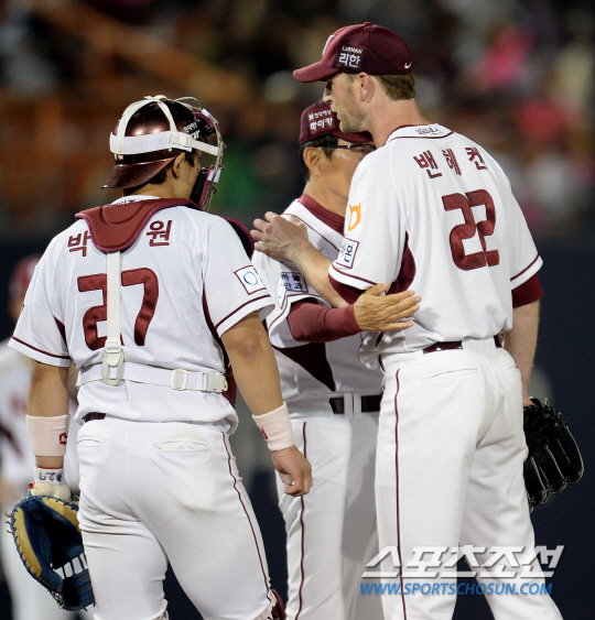삼성 라이온즈와 넥센 히어로즈의 2014 프로야구 경기가 8일 목동구장에서 열렸다. 넥센 선발 밴헤켄이 7회초 1사 1,2루 김태완 타석 때 강판되고 있다. 목동=정재근 기자 cjg@sportschosun.com/2014.10.08/ |