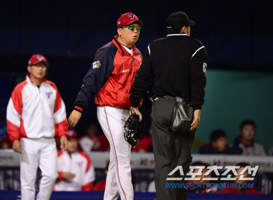 8일 잠실구장에서 프로야구 두산과 KIA의 경기가 열렸다. 두산은 유희관이 KIA는 양현종이 선발 출전해 맞대결을 펼쳤다. KIA 5회 무사 1루에서 신종길의 2루가 태그 아웃이 되었다. KIA 선동열 감독은 합의 판정을 요구했으나 판정은 세이프로 번복되지 않았다. 그라운드에 나와 비디오 합의 판정에 항의하고 있는 선동열 감독. 잠실=송정헌 기자 songs@sportschosun.com
