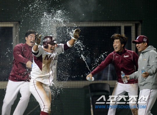 삼성 라이온즈와 넥센 히어로즈의 2014 프로야구 경기가 8일 목동구장에서 열렸다. 10회말 1사 3루 넥센 이택근의 포수앞 땅볼 때 3루주자 서건창이 홈인하며 4-3 끝내기 승리를 이끌었다. 동료들이 서건창에게 물을 뿌리며 환호하고 있다. 서건창은 이날 3안타를 치며 193안타를 기록했다. 목동=정재근 기자 cjg@sportschosun.com/2014.10.08/ |