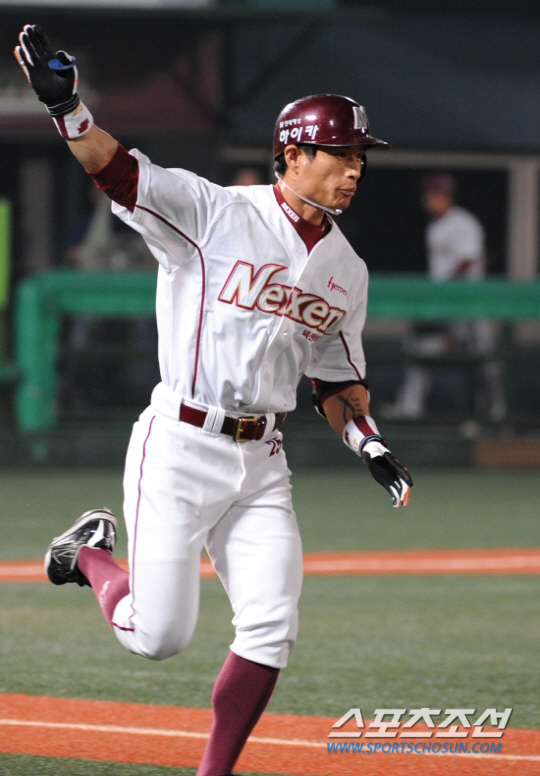 넥센 송지만이 9일 목동야구장에서 열린 프로야구 한화전 6회 1사 만루에서 대타로 나서 한화 윤근영을 상대로 만루포를 날렸다. 1루 베이스를 향해 달려 나가며 손가락을 들어 기뻐하는 송지만. 목동=송정헌 기자 songs@sportschosun.com/2011.9.9