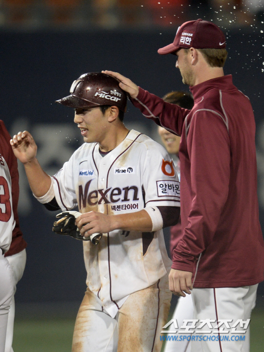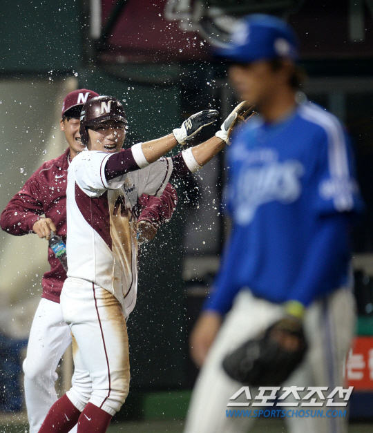 삼성 라이온즈와 넥센 히어로즈의 2014 프로야구 경기가 8일 목동구장에서 열렸다. 10회말 1사 3루 넥센 이택근의 포수앞 땅볼 때 3루주자 서건창이 홈인하며 4-3 끝내기 승리를 이끌었다. 동료들이 서건창에게 물을 뿌리며 환호하고 있다. 서건창은 이날 3안타를 치며 193안타를 기록했다.목동=정재근 기자 cjg@sportschosun.com/2014.10.08/