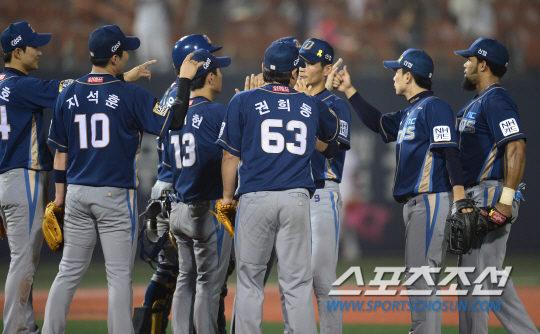 NC 다이노스와 넥센 히어로즈의 주말 3연전 마지막 경기가 13일 목동구장에서 열렸다. NC가 9대1의 승리를 거두며 위닝시리즈를 달성했다. 2위 넥센에 반게임차로 따라붙은 NC 선수들이 승리를 자축하고 있다. 목동=정재근 기자 cjg@sportschosun.com/2014.07.13/