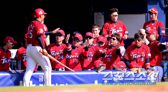 9일 오후 서울 잠실야구장에서 2014 프로야구 KIA와 LG의 경기가 열렸다. 2회초 무사 1,3루서 3루주자 이범호가 신종길의 적시타 때 홈에 들어와 동료들과 하이파이브를 나누고 있다. 잠실= 김경민 기자 kyungmin@sportschosun.com / 2014.10.09. |