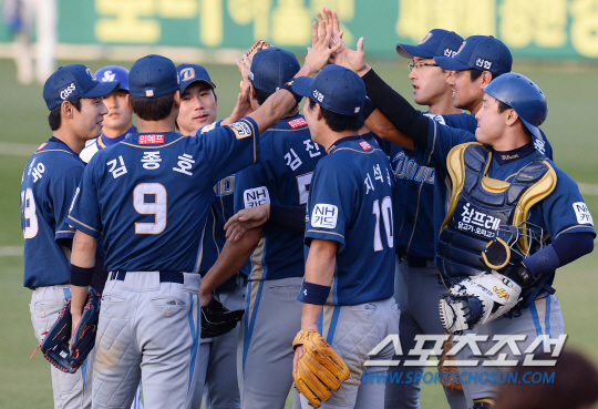 2014 프로야구 삼성라이온스와 NC다이노스의 경기가 9일 대구시민운동장 열렸다. NC 선수들이 삼성을 상대로 9대4로 역전승한후 기쁨의 하이파이브를 나누고있다. 대구=최문영 기자 deer@sportschosun.com /2014.10.09/