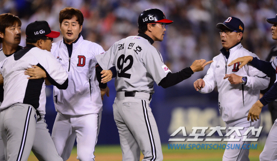 11일 오후 서울 잠실야구장에서 2014 프로야구 LG와 두산의 경기가 열렸다. 4회초 1사 1,3루서 LG 박경수의 보내기 번트 때 두산 마야가 LG 덕아웃을 보고 항의하자 이에 양상문 감독이 그라운드로 뛰어나와 양팀 선수들이 엉키는 벤치 클리어링이 벌어졌다. LG 양상문 감독과 두산 송일수 감독이 언쟁을 벌이고 있다. 잠실=김경민 기자 kyungmin@sportschosun.com / 2014.10.11.