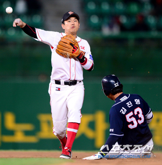 13일 인천 문학구장에서 프로야구 SK와 두산의 경기가 열렸다. SK 여건욱과 두산 유희관이 선발 맞대결을 펼쳤다. 두산 5초 무사 1루 민병헌의 투수 앞 땅볼 타구 때 1루주자 김진형이 2루에서 포스 아웃을 당하고 있다. 인천=송정헌 기자 songs@sportschosun.com