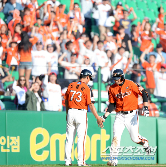 SK와 한화의 2014 프로야구 경기가 5일 인천 문학구장에서 열렸다. 7회초 한화 송광민이 중월 솔로홈런을 날린 후 이종범 3루 코치와 기쁨을 나누고 있다. 인천=허상욱 기자 wook@sportschosun.com/2014.10.05/ |