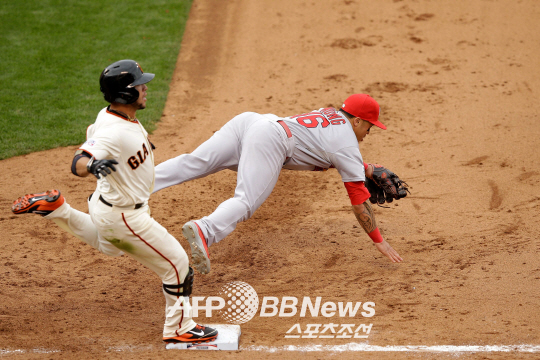 | 샌프란시스코 자이언츠가 15일(한국시각) 내셔널리그 챔피언십시리즈 3차전서 승리를 거두며 시리즈 전적 2승1패로 앞서 나갔다. 연장 10회말 그레고 블랑코가 3루로 번트를 댄 뒤 상대투수 랜디 초트의 1루 악송구로 세이프되고 있다. ⓒAFPBBNews = News1 |