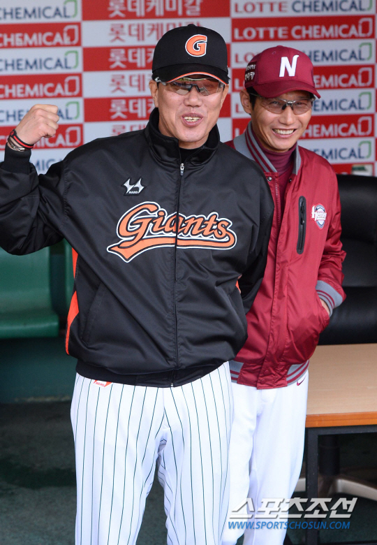 2014 프로야구 롯데자이언츠와 넥센히어로즈의 경기가 14일 부산사직야구장에서 열렸다. 경기전 넥센 염경엽 감독이 롯데 김시진 감독을 찾아 인사를 하고 있다. 부산=최문영 기자 deer@sportschosun.com /2014.10.14/