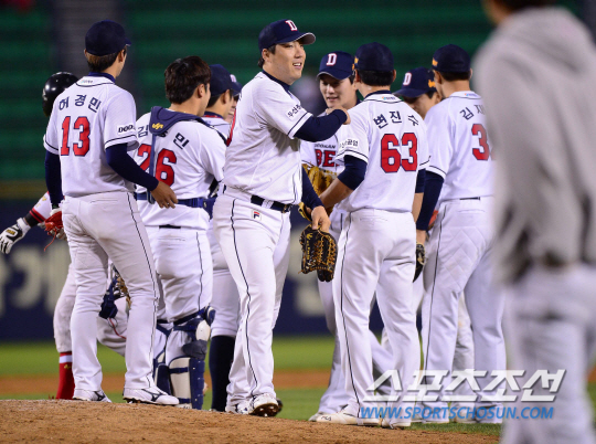 15일 오후 서울 잠실야구장에서 2014 프로야구 SK와 두산의 경기가 열렸다. 6대3으로 승리한 후 두산 선수들이 마운드 위에서 하이파이브를 나누고 있다. 잠실=김경민 기자 kyungmin@sportschosun.com