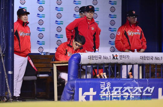 | 15일 오후 서울 잠실야구장에서 2014 프로야구 SK와 두산의 경기가 열렸다. SK 덕아웃의 이만수 감독이 코칭 스텝과 경기를 지켜보고 있다. 잠실=김경민 기자 kyungmin@sportschosun.com / 2014.10.15. |