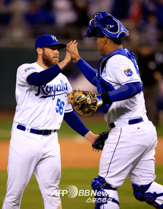 캔자스시티 로열스가 15일(한국시각) 아메리칸리그 챔피언십시리즈 3차전에서 볼티모어 오리올스를 꺾고 월드시리즈 진출에 1승만을 남겨 놓았다. 9회를 무실점으로 틀어 막은 마무리 그렉 홀랜드가 포수 살바도르 페레즈가 하이파이브를 하며 기뻐하고 있다. ⓒAFPBBNews = News1