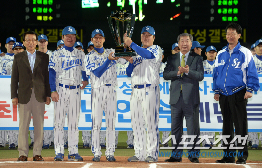 삼성과 KIA의 2014 프로야구 경기가 16일 대구 시민구장에서 열렸다. 경기 전 삼성 라이온즈 주장 최형우가 KBO 구본능 총재로부터 정규시즌 우승트로피를 전달받고 있다. 왼쪽부터 삼성라이온즈 김인 사장, 류중일 감독, 김상수, 최형우, KBO 구본능 총재, 삼성라이온즈 안현호 단장 대구=허상욱 기자 wook@sportschosun.com/2014.10.16/