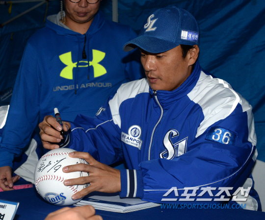16일 대구 시민구장에서 펼쳐질 삼성과 KIA의 2014 프로야구 경기 전 정규시즌 우승을 확정지은 삼성 선수단의 팬사인회가 열렸다. 이승엽이 팬에게 사인볼을 전하고 있다. 대구=허상욱 기자 wook@sportschosun.com/2014.10.16/