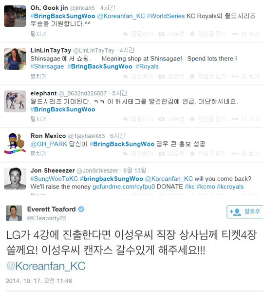 LG 외국인 투수 티포드도 동참했다. 티포드는 자신의 SNS에 "LG가 4강에 진출한다면, 이성우씨 직장상사님께 티켓 4장을 쏘겠다. 그를 캔자스에 보내달라"라는 글을 올렸다.