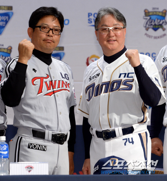 NC와 LG의 2014 프로야구 준플레이오프 미디어데이가 18일 창원 마산종합운동장 내 올림픽 기념 공연장에서 열렸다. 양팀 감독과 대표선수들이 포즈를 취하고 있다. 양팀 감독과 대표선수들의 공식 기자회견과 포토타임 등이 진행되는 미디어데이 행사에는 NC 김경문 감독과 주장 이호준, 손민한이 LG는 양상문 감독과 주장 이진영과 신정락이 참석했다. 창원=허상욱 기자 wook@sportschosun.com/2014.10.18/