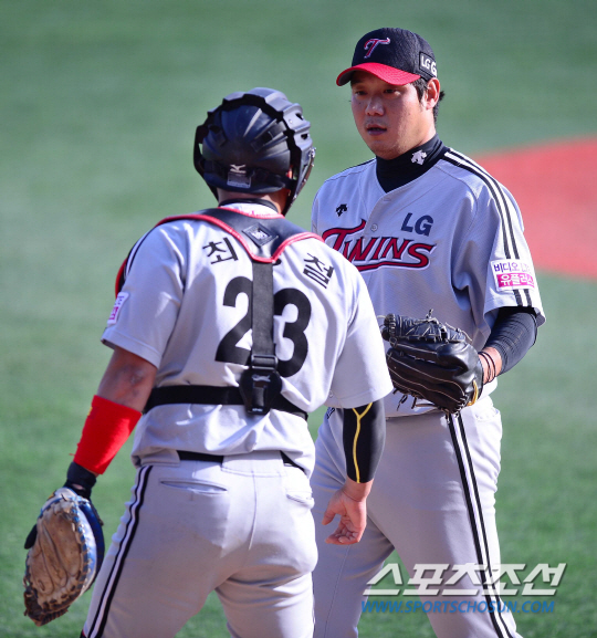 19일 오후 창원시 마산야구장에서 2014 프로야구 준플레이오프 1차전 LG와 NC의 경기가 열렸다. 4회말 2사 3루서 NC 이호준을 좌익수 플라이 아웃 처리 한 LG 류제국이 포수 최경철과 이야기를 나누고 있다. 창원=김경민 기자 kyungmin@sportschosun.com/ 2014.10.19.