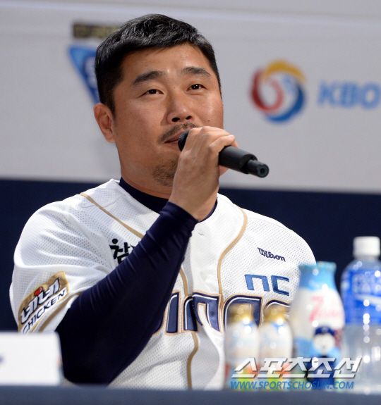 NC와 LG의 2014 프로야구 준플레이오프 미디어데이가 18일 창원 마산종합운동장 내 올림픽 기념 공연장에서 열렸다. NC 이호준이 질문에 답하고 있다. 양팀 감독과 대표선수들의 공식 기자회견과 포토타임 등이 진행되는 미디어데이 행사에는 NC 김경문 감독과 주장 이호준, 손민한이 LG는 양상문 감독과 주장 이진영과 신정락이 참석했다. 창원=허상욱 기자 wook@sportschosun.com