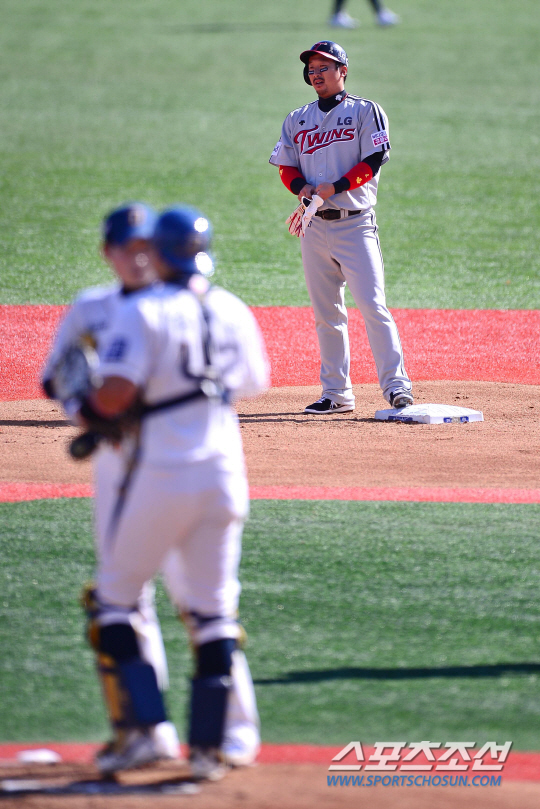 19일 오후 창원시 마산야구장에서 2014 프로야구 준플레이오프 1차전 LG와 NC의 경기가 열렸다. 1회초 1사 1,2루서 2타점 적시타를 친 LG 이병규가 NC 이재학을 바라보고 있다. 창원=김경민 기자 kyungmin@sportschosun.com/ 2014.10.19.
