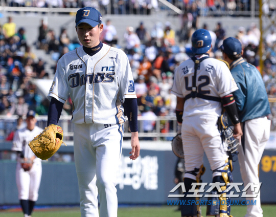 19일 경남 창원 마산구장에서 프로야구 준플레이오프 1차전 NC다이노스와 LG트윈스의 경기가 열렸다. 선발 등판한 NC 이재학이 1회도 채우지 못하고 강판 당했다. 아쉬운 표정으로 그라운드를 내려오고 있는 이재학. 창원=송정헌 기자 songs@sportschosun.com/2012.10.19