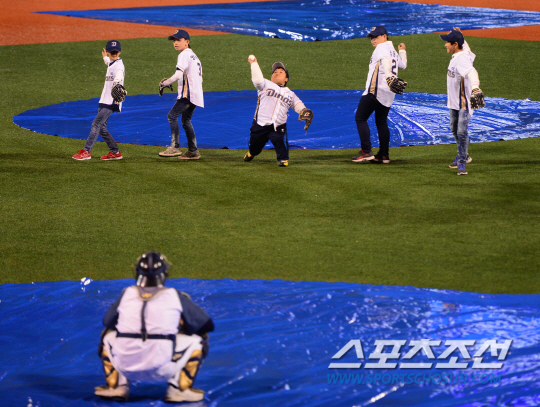 20일 오후 창원시 마산야구장에서 열릴 2014 프로야구 준플레이오프 2차전 LG와 NC의 경기가 우천취소되었다. 동반질주로 SNS를 뜨겁게 달구었던 용인 제일초등학교 김기국(가운데)등 학생들이 우천취소에도 시구를 하고 있다. 창원=김경민 기자 kyungmin@sportschosun.com/ 2014.10.20.