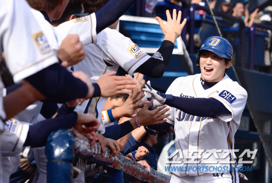 19일 경남 창원 마산구장에서 프로야구 준플레이오프 1차전 NC다이노스와 LG트윈스의 경기가 열렸다. NC 나성범이 2회 LG 류제국을 상대로 솔로홈런을 날렸다. 덕아웃에서 동료들과 하이파이브를 나누고 있는 나성범. 창원=송정헌 기자 songs@sportschosun.com/2014.10.19