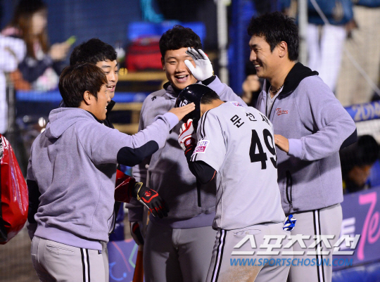 22일 경남 창원시 마산구장에서 프로야구 준플레이오프(준PO) 2차전 NC다이노스와 LG트윈스의 경기가 열렸다. 9회초 1사 1루서 아웃카운터를 착각한 1루주자 문선재가 이병규의 타구를 놓친 NC 박민우의 실책 때 홈에 들어온 후 덕아웃에서 동료들과 환호하고 있다. 창원=김경민 기자 kyungmin@sportschosun.com / 2014.10.22.