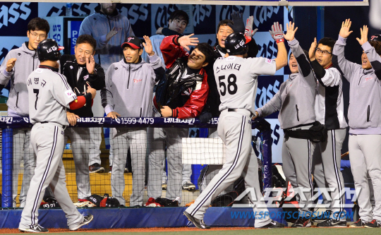 22일 경남 창원 마산구장에서 프로야구 준플레이오프(준PO) 2차전 NC다이노스와 LG트윈스의 경기가 열렸다. LG 스나이더가 4회 NC 에릭을 상대로 투런 홈런을 날렸다. 덕아웃에서 동료들과 하이파이브를 나누고 있는 스나이더. 창원=송정헌 기자 songs@sportschosun.com/2014.10.22