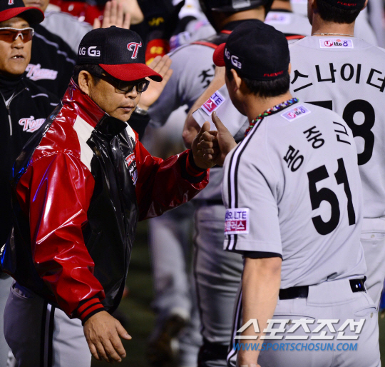 22일 경남 창원시 마산구장에서 프로야구 준플레이오프(준PO) 2차전 NC다이노스와 LG트윈스의 경기가 열렸다. 4대2로 승리한 후 LG 양상문 감독이 봉중근 등 선수들과 주먹을 맞추고 있다. 창원=김경민 기자 kyungmin@sportschosun.com / 2014.10.22.