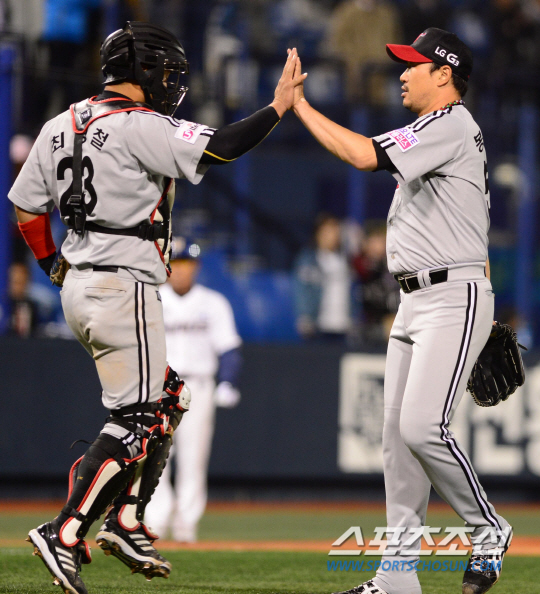 22일 경남 창원 마산구장에서 프로야구 준플레이오프(준PO) 2차전 NC다이노스와 LG트윈스의 경기가 열렸다. LG가 NC에 4대2로 승리하며 시리즈 2승을 먼저 달성했다. 경기 종료 후 봉중근과 최경철이 하이파이브를 나누고 있다. 창원=송정헌 기자 songs@sportschosun.com/2014.10.22