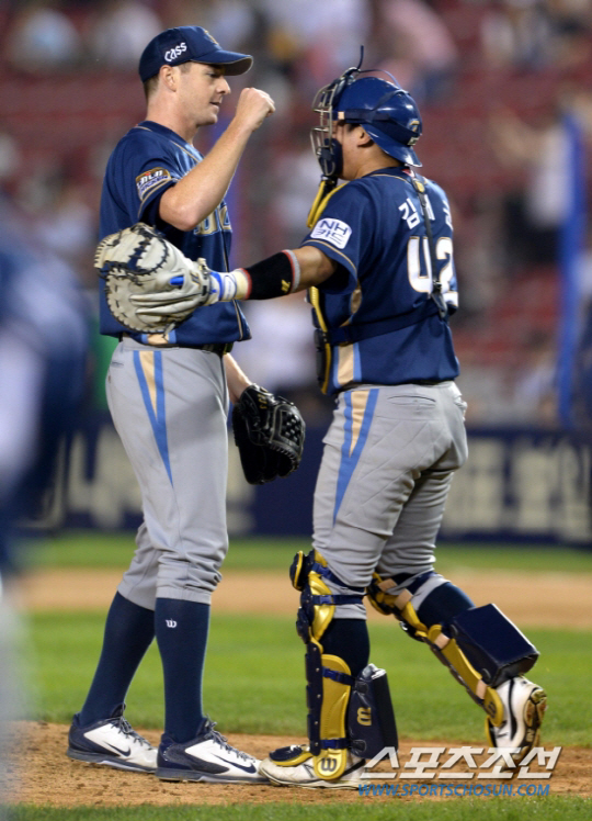 NC 찰리가 노히트노런을 달성했다. 24일 잠실구장에서 열린 LG와 NC의 주중 3연전 첫번째 경기에서 6대0 승리와 함께 노히트노런의 대기록을 작성한 후 포수 김태군과 포옹을 하고 있다. 찰리의 노히트노런은 통산 11번째이며 외국인선수로는 최초다. 잠실=허상욱 기자 wook@sportschosun.com/2014.06.24/