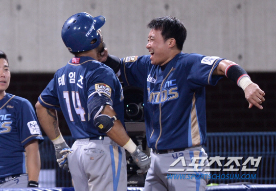 26일 오후 포항 종합운동장 야구장에서 2014 프로야구 NC와 삼성의 경기가 열렸다. 7회초 1사서 NC 테임즈가 우월 솔로홈런을 친 후 덕아웃에서 김태군과 '수염뽑기' 세리머니를 펼치고 있다. 포항=김경민 기자 kyungmin@sportschosun.com / 2014.07.26.