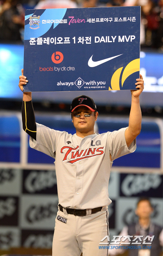 19일 경남 창원 마산구장에서 프로야구 준플레이오프 1차전 NC다이노스와 LG트윈스의 경기가 열렸다. LG가 NC에 13대 4로 대승을 거두며 1차전을 승리했다. 경기 종료 후 경기 MVP를 차지한 최경철이 수상하고 있다. 창원=송정헌 기자 songs@sportschosun.com/2014.10.19