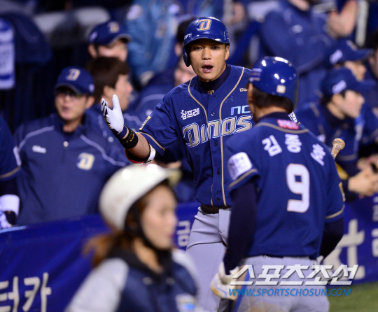 24일 잠실구장에서 2014프로야구 준PO 3차전 LG 트윈스와 NC 다이노스의 경기가 열렸다. LG가 마산 원정 1, 2차전을 승리하며 PO 진출에 1승 만을 남겨놓고 있다. 1회초 2사 1루서 테임즈의 중전 안타 때 송구가 빠진 틈을 타 홈에 들어온 1루주자 김종호가 이종욱과 하이파이브를 나누고 있다. 잠실=김경민 기자 kuyngmin@sportschosun.com