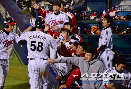 24일 잠실구장에서 2014프로야구 준PO 3차전 LG 트윈스와 NC 다이노스의 경기가 열렸다. LG가 마산 원정 1, 2차전을 승리하며 PO 진출에 1승 만을 남겨놓고 있다. 4회말 1사 1,3루서 3루주자 스나이더가 손주인의 희생 플라이 때 홈에 들어와 동료들과 하이파이브를 나누고 있다. 잠실=김경민 기자 kuyngmin@sportschosun.com / 2014.10.24.