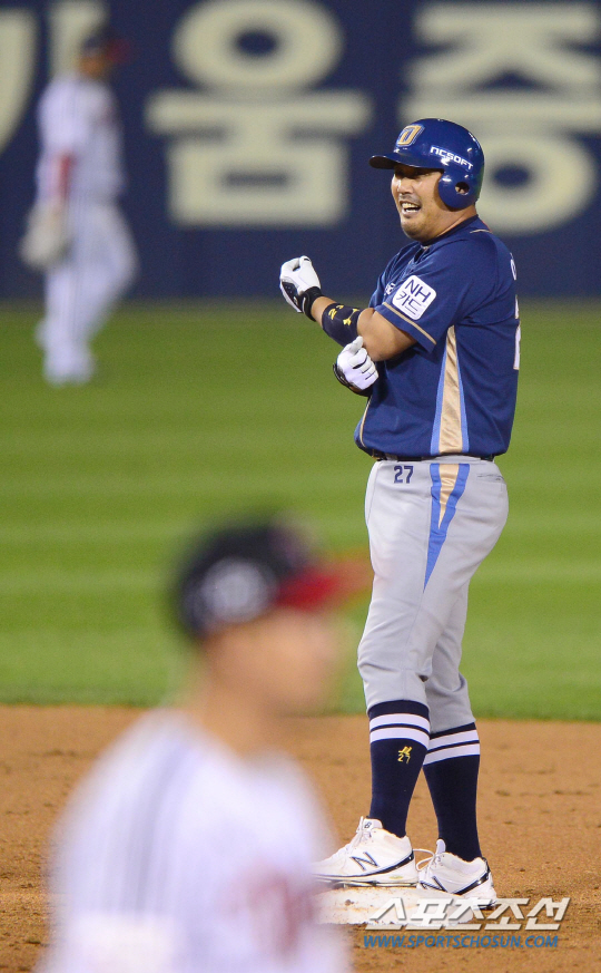 24일 잠실구장에서 2014프로야구 준PO 3차전 LG 트윈스와 NC 다이노스의 경기가 열렸다. LG가 마산 원정 1, 2차전을 승리하며 PO 진출에 1승 만을 남겨놓고 있다. LG 리오단과 NC 찰리가 선발 맞대결을 펼쳤다. NC 1회 2사 2루에서 이호준의 2루타 때 2루주자 테임즈가 득점에 성공했다. 2루에서 밝은 표정을 보이고 있는 이호준. 잠실=송정헌 기자 songs@sportschosun.com